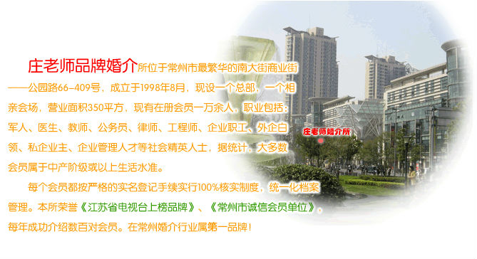 ★ ★ ★ ★ ★ 庄老师婚姻介绍所始于1988年 立足于优秀的资源和丰富介绍经验 重视认可客户择偶标准签合同开展包成功业务。江苏电视台上榜品牌 诚信单位. 本所理念: 提高婚恋质量,成就高品质生活!